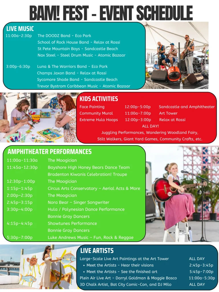 BAM!Fest (Bradenton Art & Music Festival) is a dynamic, diverse, immersive experience featuring art in action on along the Bradenton Riverwalk. Enjoy musicians from a variety of genres on multiple stages, pop up performance acts along the Riverwalk, students sharing their talents, live creation of large scale visual art, interactive art projects, and culinary treats from local food vendors.